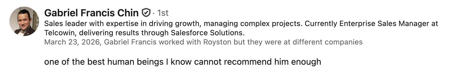 "I got in touch with Royston, and he really shine a light on everything that's wrong within my business and everything. And he really helped me fix things as we went along. And, thanks to him and his insights, we managed to have, some really good performances. we were having sales calls with potential clients who were closing deals. I don't leave reviews. I hardly ever do. But really, for in this instance, I really need to say something so that whoever's looking to sign up, you know, they can really, take this on board. And if you're going to work with anyone to grow your business and learn from someone, Royston, he's your man.