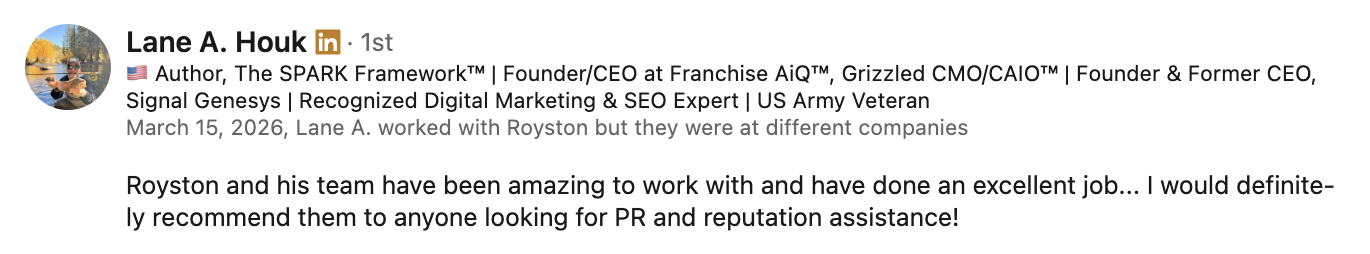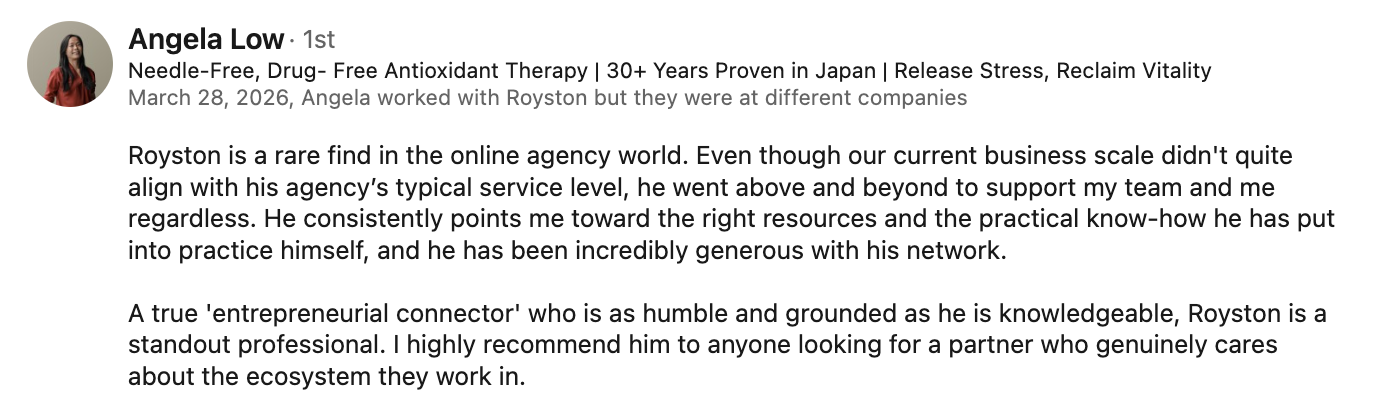 "I got in touch with Royston, and he really shine a light on everything that's wrong within my business and everything. And he really helped me fix things as we went along. And, thanks to him and his insights, we managed to have, some really good performances. we were having sales calls with potential clients who were closing deals. I don't leave reviews. I hardly ever do. But really, for in this instance, I really need to say something so that whoever's looking to sign up, you know, they can really, take this on board. And if you're going to work with anyone to grow your business and learn from someone, Royston, he's your man.